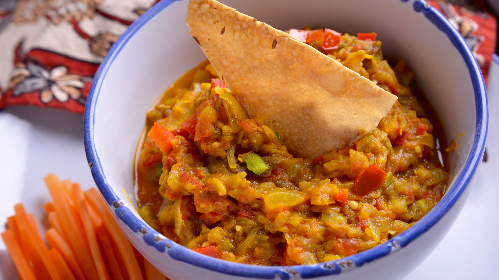 Emplatamos la mezcla de berenjena y pimientos picados con el sofrito en un bol y acompañamos con los palitos de zanahoria y los papadums fritos.