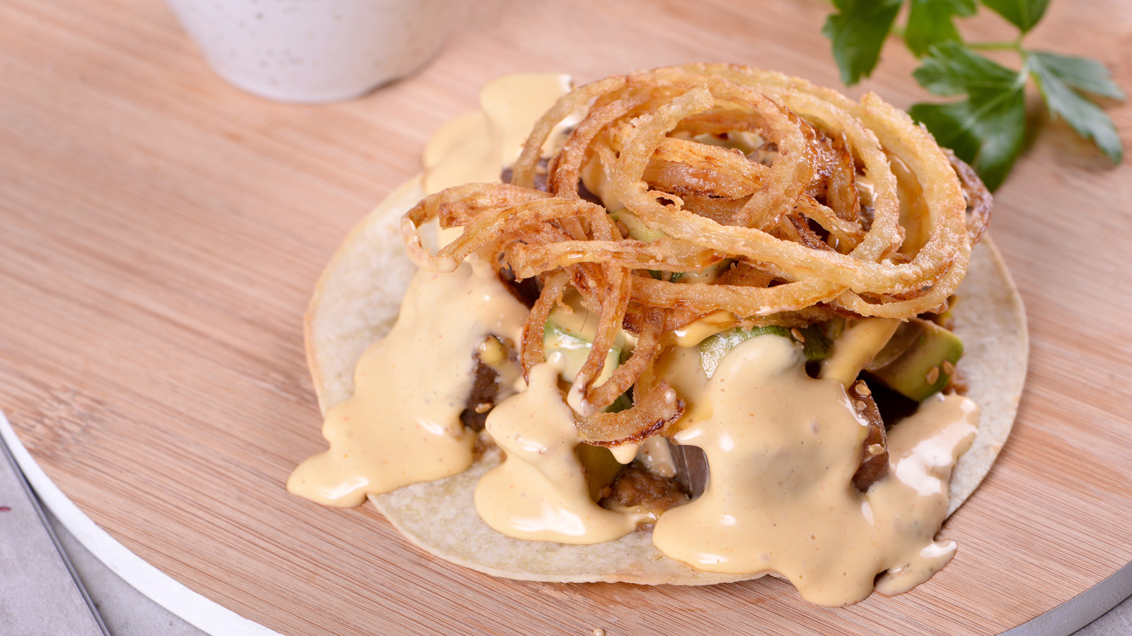 Preparamos una mahonesa casera y la mezclamos con salsa valentina que pondremos por encima. Espolvoreamos los aros de cebolla y listo.