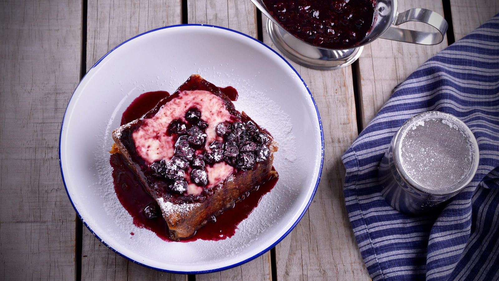 Tostada francesa con crema agria y arándanos salteados (French toast)