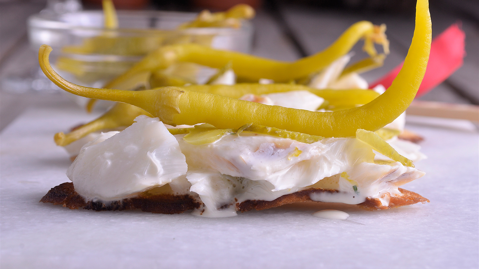 Untamos las rebanadas de pan con la mezcla de bacalao. Terminamos con unas rodajas de pepinillo y una guindilla.