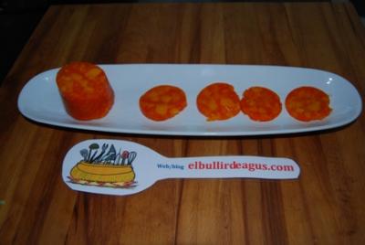 •Cuando haya hervido un par de minutos, se echan 200 ml de agua fría más y la batata que la tendremos ya escurrida. Se mezcla todo bien y hay que intentar: o con un film transparente o con un molde cílindrico, que quede forma de salami fino (yo utilicé un bote de plástico fino, que pude rajar fácilmente, pero con film transparente o un vaso de tubo, también se puede realizar). Se deja enfríar en el frigorífico toda la noche.