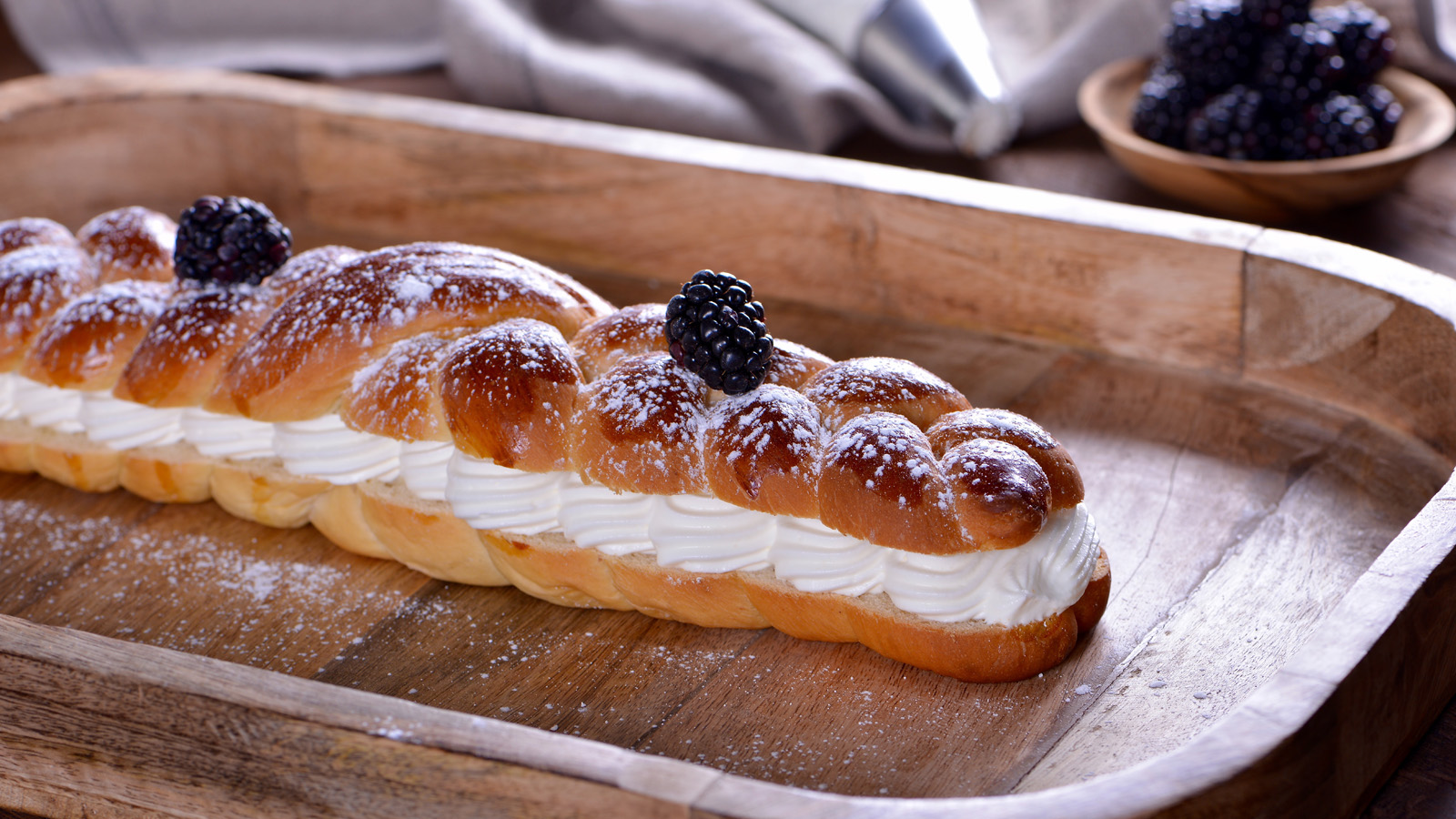 Sacamos la trenza del horno y dejamos enfriar. Podemos comerla así, con azúcar glas por encima o abrirla por la mitad y rellenar con nata y moras.