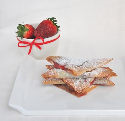 Colocar una cucharadita de Nutella, dos medias fresas con la parte cortada boca abajo y empezar a doblar, la mantequilla nos servirá de “pegamento” y una vez dobladas, los colocaremos sobre una bandeja de horno cubierta con papel de hornear.