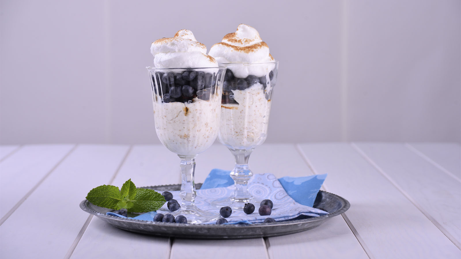 Quemamos con un soplete las claras y decoramos con menta.