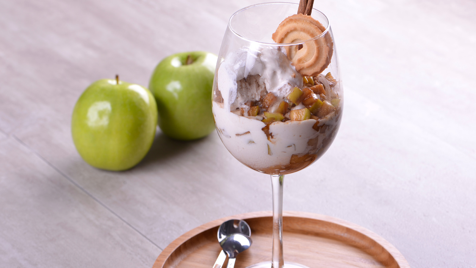 Montamos el trifle en un vaso de sidra poniendo en la base el crumble, encima helado de leche merengada, encima una capa de manzana.