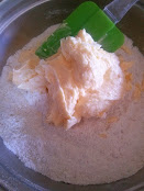 Verteremos esta mezcla a la de los ingredientes secos e incorporaremos, primero en el cuenco, y después volcaremos la mezcla en una superficie lisa, seguiremos mezclando pero sin amasar, no hay que trabajarla demasiado.