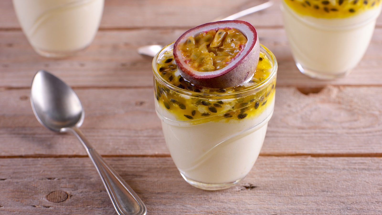 Cubrimos con una capa de sirope de maracuyá y decoramos con media maracuyá cada vasito.