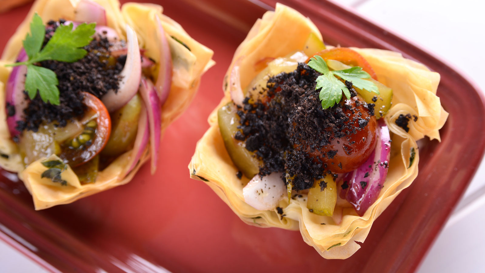 En el episodio 180 del programa Fácil y Resultón T9, el cocinero Gonzalo D'Ambrosio prepara una receta de Vasitos griegos de masa filo.