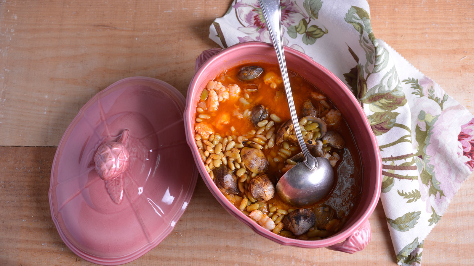 Volcamos el caldo de las cigalas en la olla, que ya estará listo, y las hervimos a fuego medio-bajo durante aproximadamente dos horas y media hasta que el caldo rebaje y las verdinas estén tiernas.