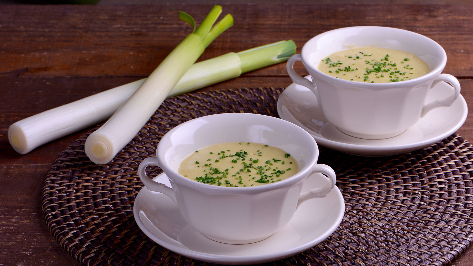 En el capítulo 37 del programa de televisión Cocina Francesa T2, nuestra cocinera Evelyne Ramelet prepara la receta de Vichyssoise (Crema fría de puerros).