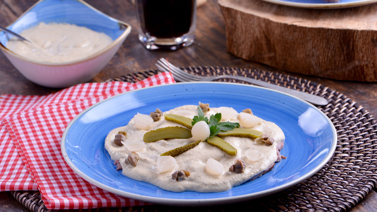 Para finalizar, colocamos lonchas de carne en un plato y colocamos encima la salsa. Decoramos con pepinillos y cebollitas, y servimos.