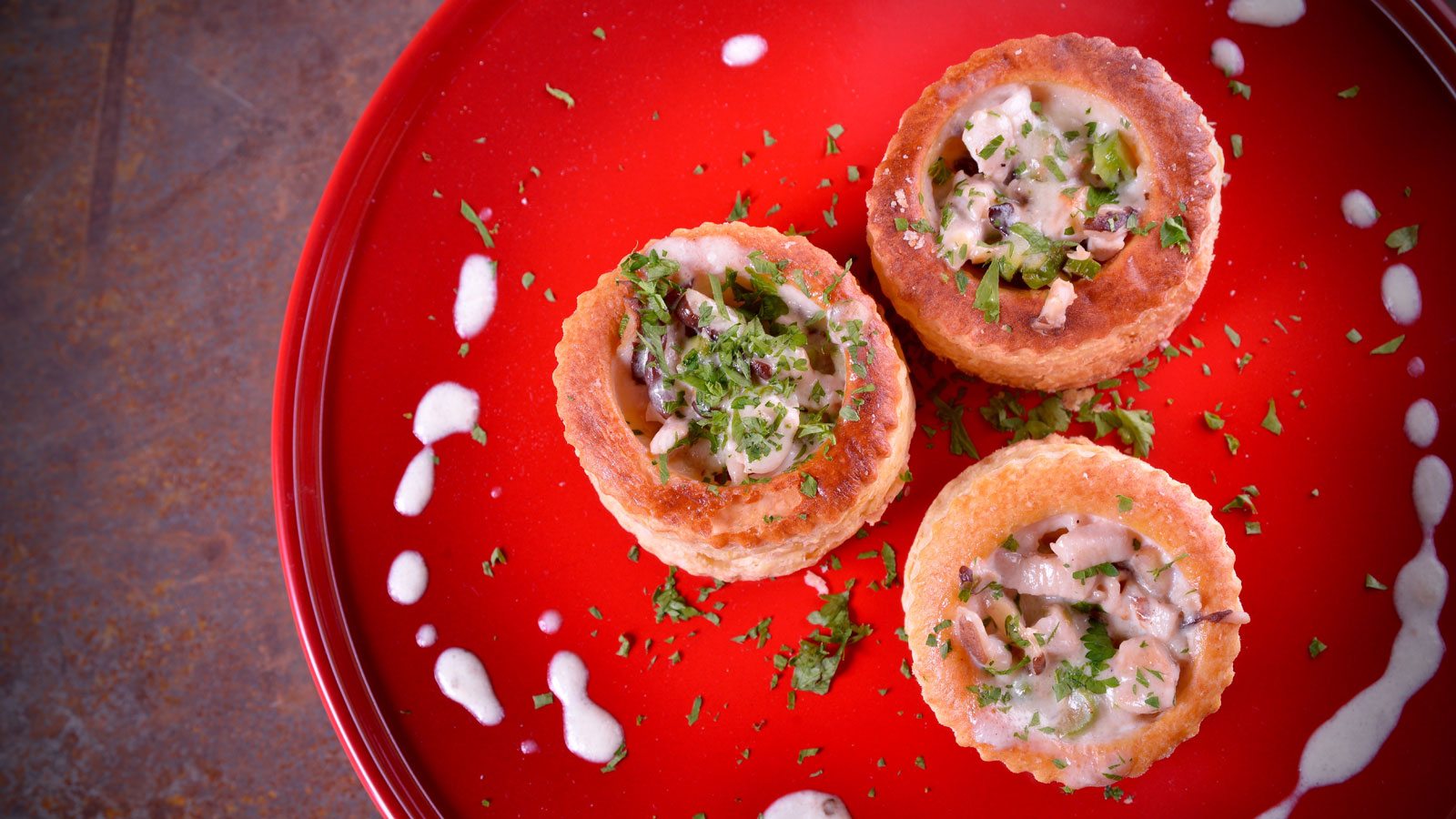 Seguidamente, rellenamos los volovanes de hojaldre con las verduras y el pollo. Cubrimos con la salsa de manchego. Rematamos con un poco de perejil picado por encima.