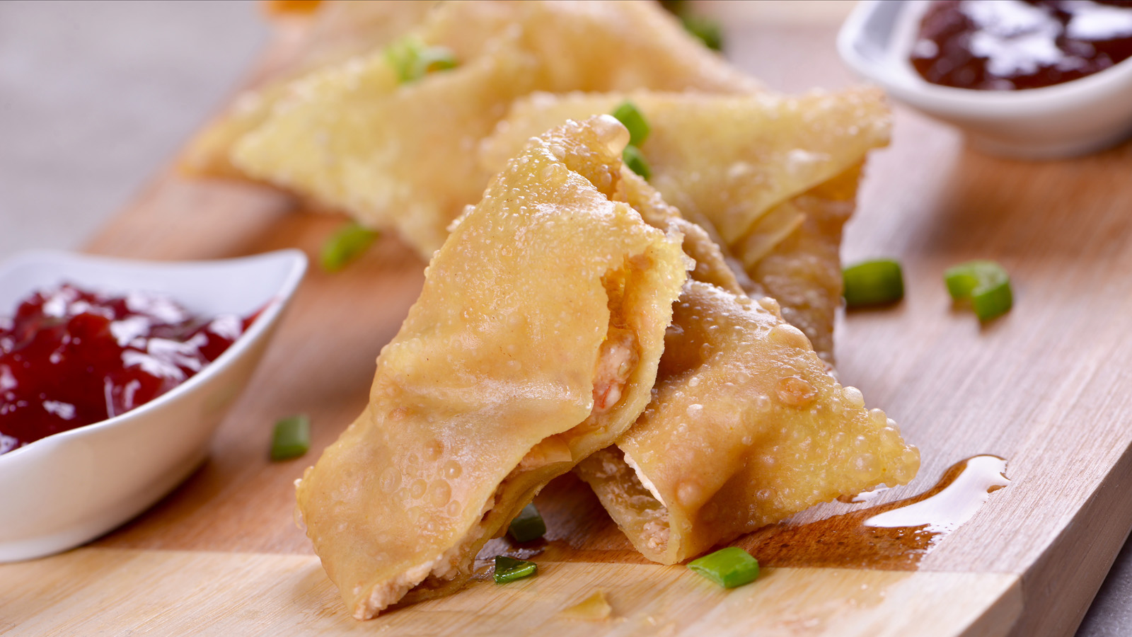 Mezclamos bien y ponemos una bolita de esta mezcla en cada placa de wanton. Cerramos untando los bordes con huevo batido y freímos en abundante aceite vegetal muy caliente hasta que estén dorados. Retiramos sobre un papel para evitar el exceso de grasa y acompañamos con chutney de mando y mermelada de arándanos. Servimos con verde de cebolleta.