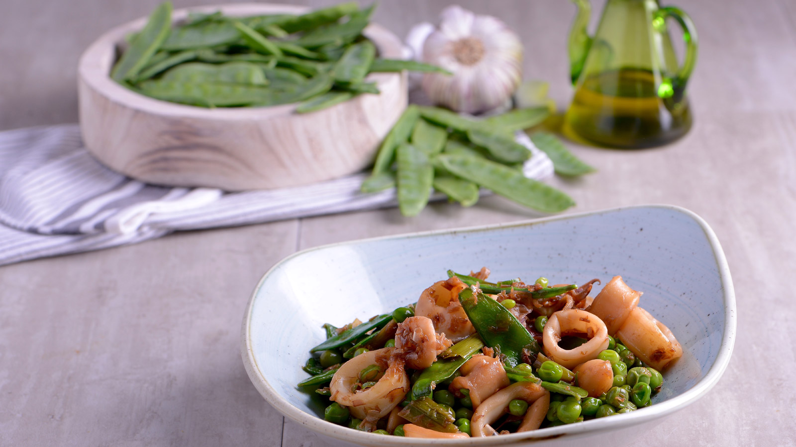En cuanto tomen color, incorporamos al wok 150 g de tirabeques lavados y pelados, un puñado de guisantes descongelados y 2 cebolletas chinas lavadas, peladas y picadas.