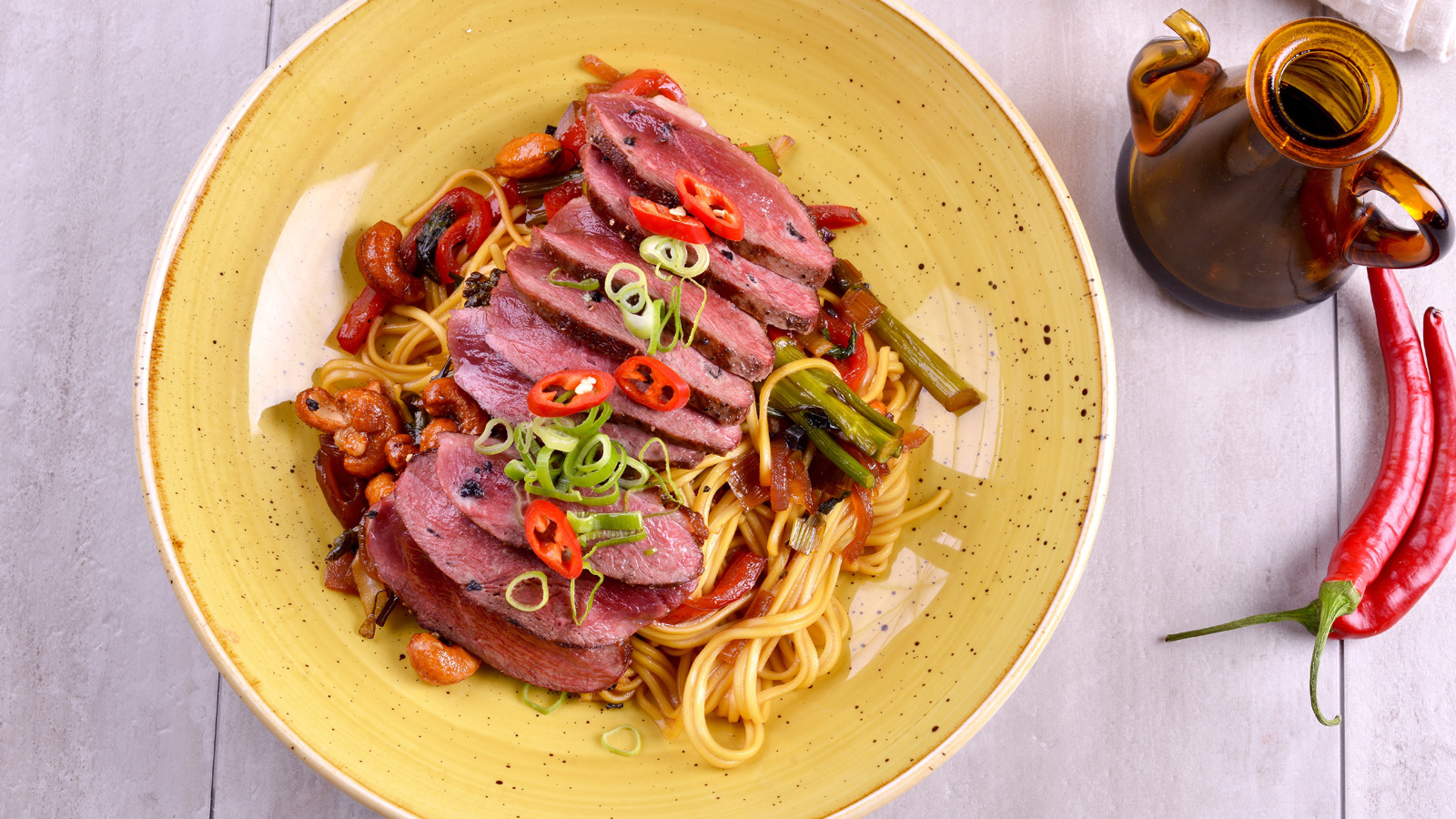 Wok de noodles con magret de pato teriyaki