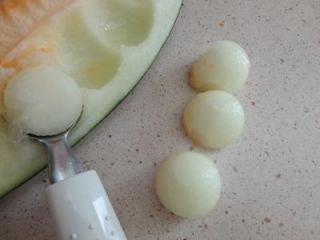 - Cortamos en trocitos de unos 2cm el pollo y el melón. Yo el melón lo hago en bolitas con un sacabolas porque queda más chulo ;-)