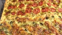 Focaccia de tomate cherry y olivas verdes y parmesano con cebolla y aceitunas negras (pan tipo tagliatella)