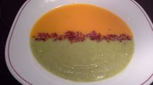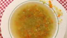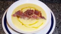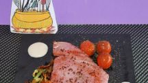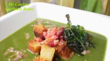 Revuelto de habas y guisantes con jamon, langostinos al aroma del moscatel