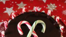 Cheesecake de chocolate y peppermint con bastones de caramelo