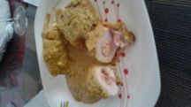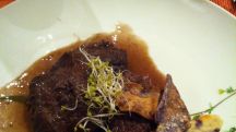 Secreto de cerdo con salsa de mango, patatas confitadas y tapenade de aceitunas negras