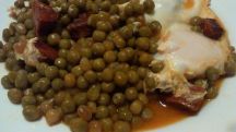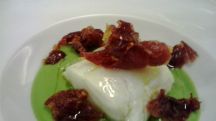 Crema de guisantes y menta con bacalao confitado y jamón ibérico