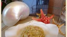 Brochetas al horno de salmón, rape y langostinos con cantharellus tubaeformis.