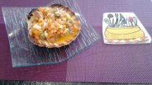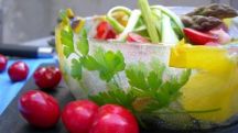 Bol helado de ensalada de aguacate, gambas y cerezas