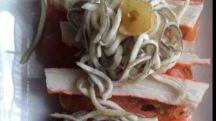 Salmón con falsas angulas y txaca