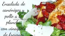 Ensalada de canónigos y pollo a la plancha con vinagreta de fresones