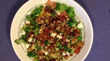 Ensalada de pera caramelizada con panceta, gorgonzola y vinagreta de miel templada