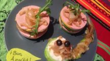 Milhojas de foie de pato con manzana y cebolla caramelizada, acompañado de milhoja de gusano con philadelfia