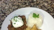 Picadinho carioca con arroz, huevo poche, farofa de huevos y banana milanesa