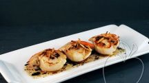 Vieiras asadas con salsa de cafÉ y jengibre crujiente