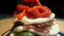 Milhojas de mozzarella con aceitunas, jamon y pimenton