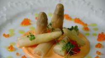 Yemas de espárragos con mahonesa de piquillos y huevas de trucha