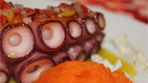 Pulpo braseado con salsa criolla y crema de patatas y piquillo